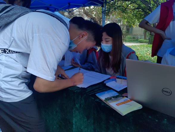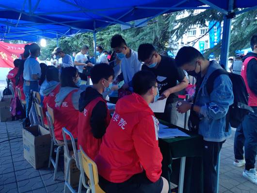他们有的在门口辛苦地举着院旗接应,有的在接待处耐心地接受家长和新同学的咨询,有的微笑着为学弟学妹办理手续,还有部分同学因场地有限一直默默地坐在台阶上等待着新同学办理完手续便带领他们去往宿舍区。