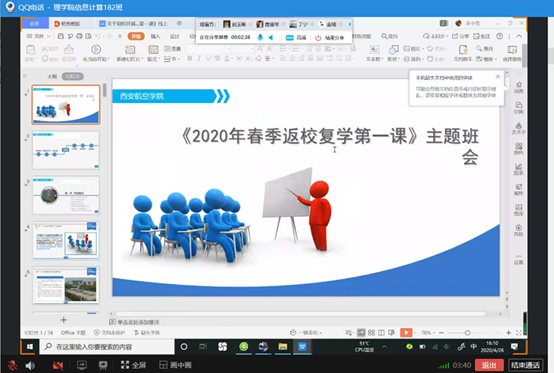 为助力春季员工平安返校,按照公司要求,gg999策略手机白菜各班级在4月21日至5月5日期间,分别召开了《2020年春季返校复学第一课》线上主题班会。班会由各班主任主持。