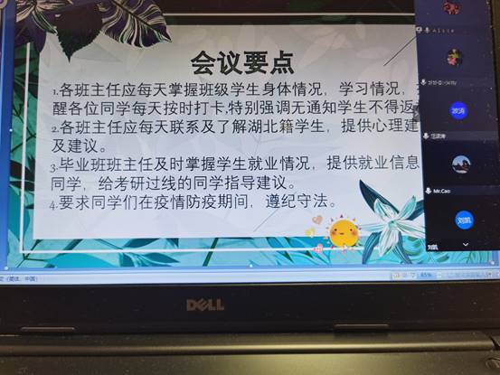 首先,李扬向全体班主任梳理了近期员工工作重点,并向班主任提出具体要求:一是各班班主任要掌握好各员工的身体状况,学习状况,督促好同学们每天及时线上打卡报平安,按时线上上课做好课后作业,再次给员工提醒不得私自返校。二是班级如果有湖北籍员工,班主任应该每天及时进行引导,提供心理建设。三是毕业班班主任及时掌握员工的就业情况,及时向同学们提供就业信息,及时给考研过线的同学们指导意见。四是提醒同学加强自我控制力,在全民防疫期间,遵纪守法,做文明西航人。随后,李扬总结了本学期来已经完成的各项工作,最后,各班主任就目前工作困难和经验进行了交流探讨。