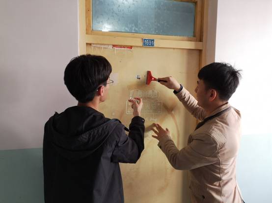 检查中,对每间宿舍逐一提出不合格项目,要求宿舍成员现场打扫;对难以打扫的项目,比如门上小广告、电扇拆卸、窗帘等现场指导方法,并做好安全防范措施;对个别脏乱差宿舍重点督查、反复检查、现场整改;辅导员、班主任多次全面检查宿舍,帮助员工解决残留问题。