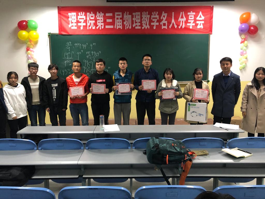 11月28号,gg999策略手机白菜举办的第三届“物理数学名人分享会”决赛在南楼408教室举行。到会的有gg999策略手机白菜辅导员杨陈东、张小妹、班主任王妙、李小雪、团学干部及大一大二全体员工。