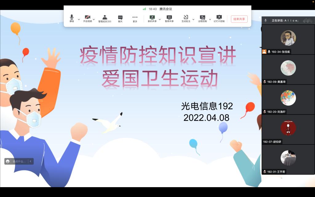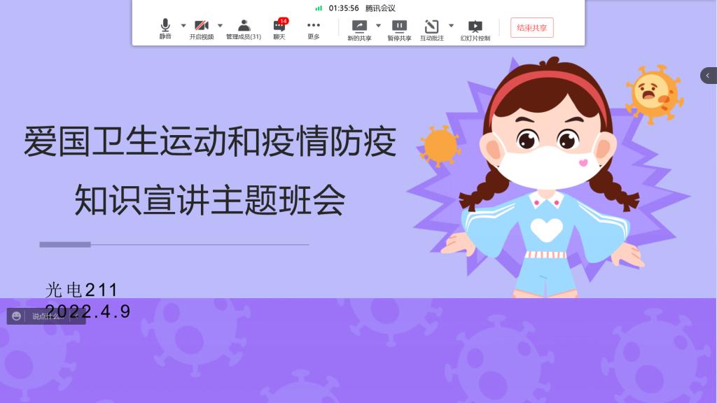按照《关于莲湖校区员工公寓驻楼工作专班后续有关工作的通知》,2022年4月6日至4月10日,gg999策略手机白菜各班级陆续召开了“爱国卫生运动及疫情防疫知识宣讲”线上主题班会。