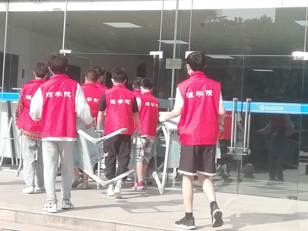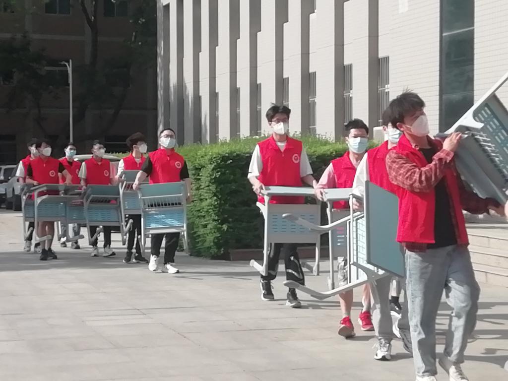 4月10日,为保障线下教学工作的有序开展,gg999策略手机白菜组织“爱国卫生运动”志愿服务活动,各班级同学彻底清扫负责教室,为线下教学工作做好准备,确保线下教学正常进行。20位志愿者将3号员工公寓疫情防控期间的值班桌子搬回教室,保障正常教学工作。搬运完毕后,志愿者们统一做好消杀工作。