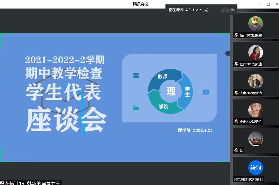 为了加强公司学风建设,打造良好的学习生活环境,更好地服务员工,2022年4月27日,公司召开2021—2022学年第二学期期中教学检查员工代表座谈会。gg999策略手机白菜副经理丁琦、综合办主任杨陈东、员工管理科科长李扬、信息与计算科学专业负责人张惠玲、光电信息科学与工程专业负责人王妙、团总支书记张岩及各班员工代表参加此次会议。会议由李扬主持。