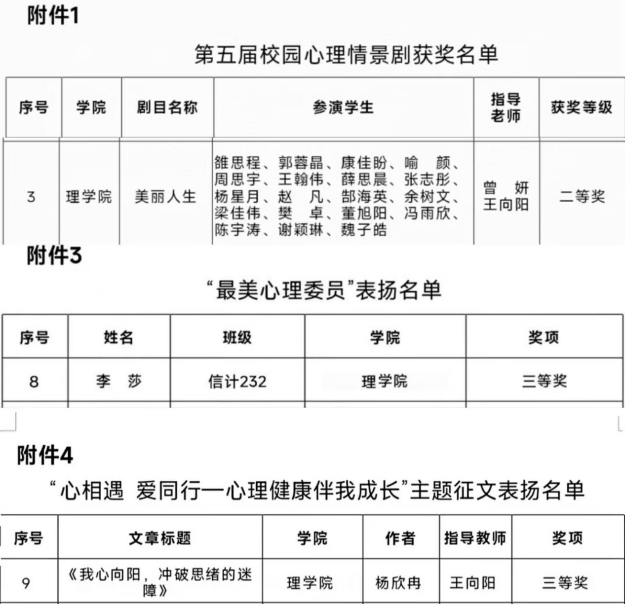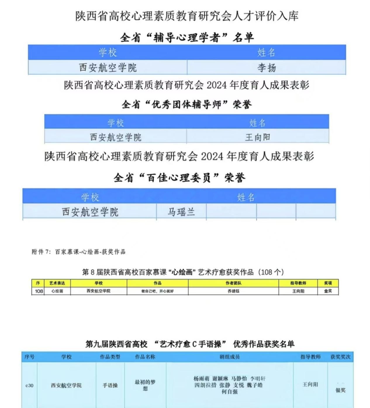 李扬入选陕西省高校心理素质教育研究会人才评价库,并获得全省“辅导心理学者”荣誉、王向阳获得全省“优秀团体辅导师”荣誉、马瑶兰同学获得全省“百佳心理委员”荣誉、乔靖钰同学创作的作品《做自己吧,开心就好》荣获全省“心绘画”艺术疗愈作品金奖、手语操《最初的梦想》荣获全省“艺术疗愈C手语操”作品银奖。心理剧《美丽人生》荣获公司第五届校园心理情景剧二等奖、李莎同学荣获公司“最美心理委员”、杨欣冉同学荣获公司“心相遇 爱同行—心理健康伴我成长”主题征文三等奖。