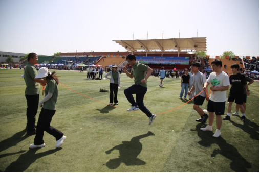 趣味运动会的师生跳大绳现场,摇绳者默契甩动长绳,参赛师生鱼贯而入,轻盈跳跃。老师们一改严肃,和员工们配合无间,偶尔绊绳也不气馁,欢声笑语中,师生同频跳动的身影,成为春日校园最温暖的风景。