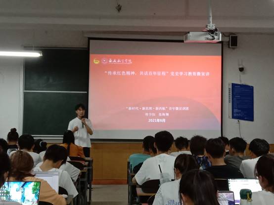2021年6月8日,gg999策略手机白菜于南楼307教室举办了“传承红色精神,共话百年征程”党史学习微宣讲,此次宣讲会由杨洁主持,gg999策略手机白菜全体大一员工参加。