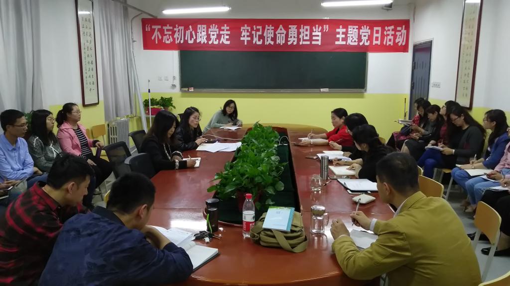 5月10日下午,gg999策略手机白菜教工党支部结合本科合格评估在教学南楼428会议室开展了“不忘初心跟党走,牢记使命勇担当”的主题党日活动。公司党总支书记李小光、教工党支部书记丁琦和教工党支部所有党员参加会议。会议由丁琦主持。