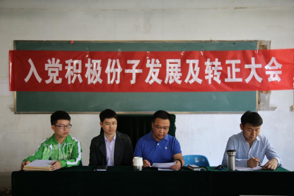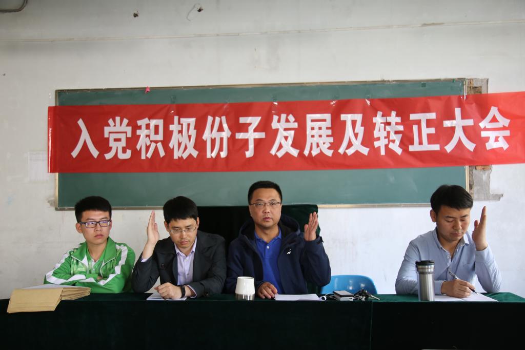 大会开始,曹老师介绍了大会准备基本情况,杨老师介绍发展对象政审情况,然后5名积极份子逐一进行入党志愿书的宣读。申请入党的同学都真情的表达了对党的向往,对党的忠诚,表示坚定不移跟党走,为党的工作付出自己的力量,为共产主义事业奋斗终生。依次表明了入党动机和他们要加入中国共产党的强烈愿望。每位发展对象发言之后,各对应入党介绍人对其学习、工作、实践活动等方面进行评价。最后拥有表决权的党员对接收预备党员进行了举手表决,最终全体正式党员一致同意发展对象正式成为预备党员。大会结束之际老师对发展党员寄予希望,希望他们随时与党组织保持一致,为同学服务,积极做好表率作用。