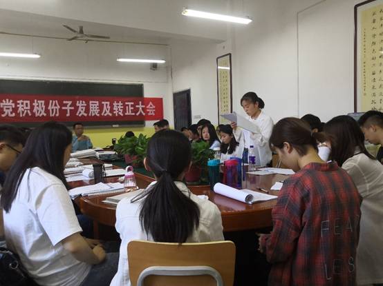 接下来,由李扬老师宣读发展对象申请转正人员名单,8名预备党员一次宣读预备期一年内思想汇报以及想需要向党组织说明的问题。宣读结束后由介绍人、党小组以及党支部发表意见。