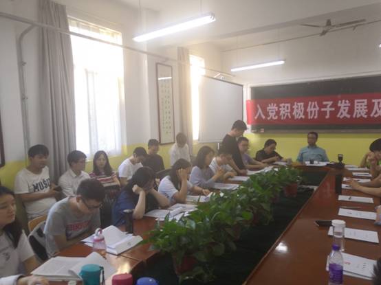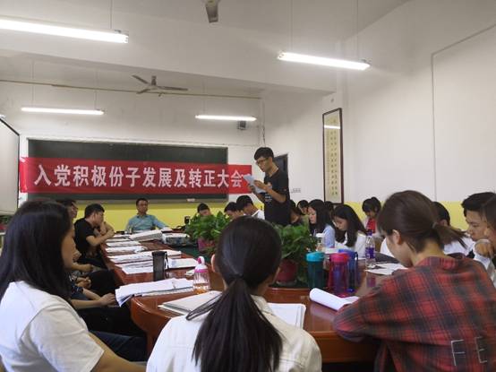 本次会议由员工党支部书记曹建波老师主持,会议开始,首先由曹建波老师宣布开会,汇报出席会议的正式党员,会议议题以及大会要求。之后11名入党积极分子宣读《入党志愿书》以及需要向党组织说明的其他问题,由入党介绍人介绍发展对象的主要情况和对其进行培养教育情况,并对其能否入党表明意见。