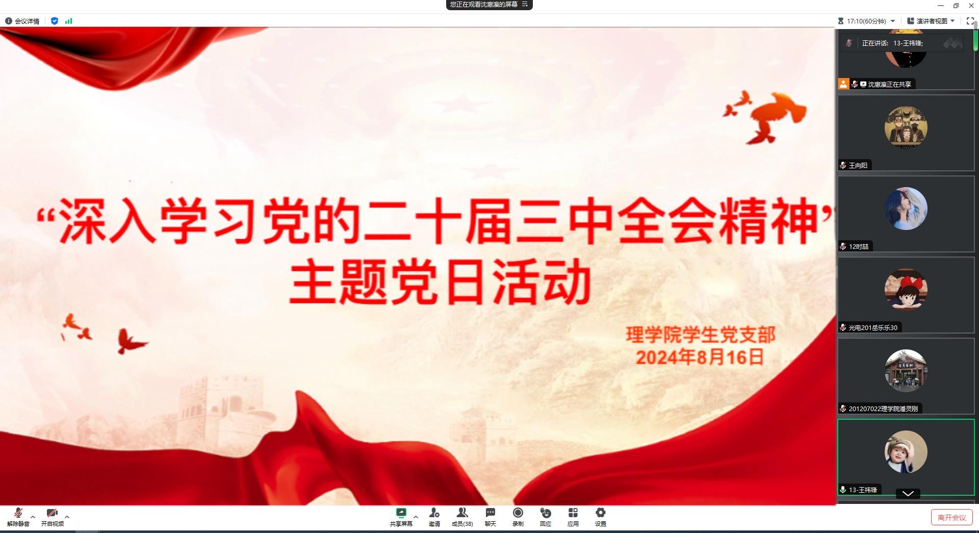 为深入学习宣传和贯彻落实党的二十届三中全会精神,2024年8月16日,gg999策略手机白菜员工党支部于线上开展“深入学习党的二十届三中全会精神”主题党日活动。活动由支部书记李扬主持并领学,教师党员王向阳、曾妍、张岩以及支部全体员工党员参加本次学习。
