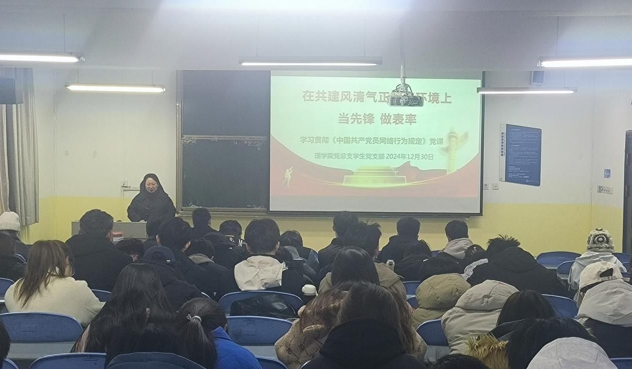 活动伊始,在组织委员王向阳的带领下,员工党员回顾总结2024。党员代表分享了在学业帮扶、志愿服务、校园文化建设等方面的成果。在学业帮扶中,成绩优异的党员同志主动为学习困难的同学答疑解惑,助力他们在知识的海洋中破浪前行,不少同学的成绩因此取得了显著进步;在志愿服务里,无论是校园环境清洁、图书馆整理,还是青年志愿者服务基地关爱离退休职工,都有他们忙碌且坚定的身影,那一次次贴心的陪伴、一堂堂生动的授课,传递着爱与关怀。随后支部书记李扬领学了《中国共产党员网络行为规定》相关内容,并为全体党员及积极分子讲授了题为“在共建风清气正网络环境上当先锋做表率”的主题党课。最后李扬强调全体同学要以此次活动为契机,将查漏补缺融入日常学习生活中,不断自我完善,自我提升,同时要将党的二十大精神和党的二十届三中全会精神内化于心、外化于行,以实际行动践行党的宗旨,为支部发展贡献力量。