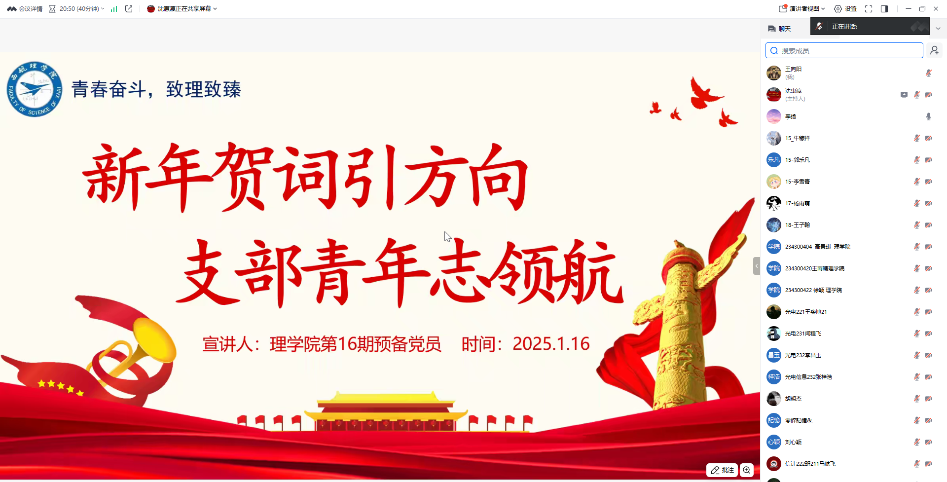 2025年1月16日gg999策略手机白菜员工支部组织开展了以“新年贺词引方向,理院青年志领航”为主题的党日活动,学习习近平主席二〇二五年新年贺词,激励广老员工党员在新的一年里挺膺担当、奋发有为。支部全体党员参加,此次活动由组织委员王向阳老师主持。