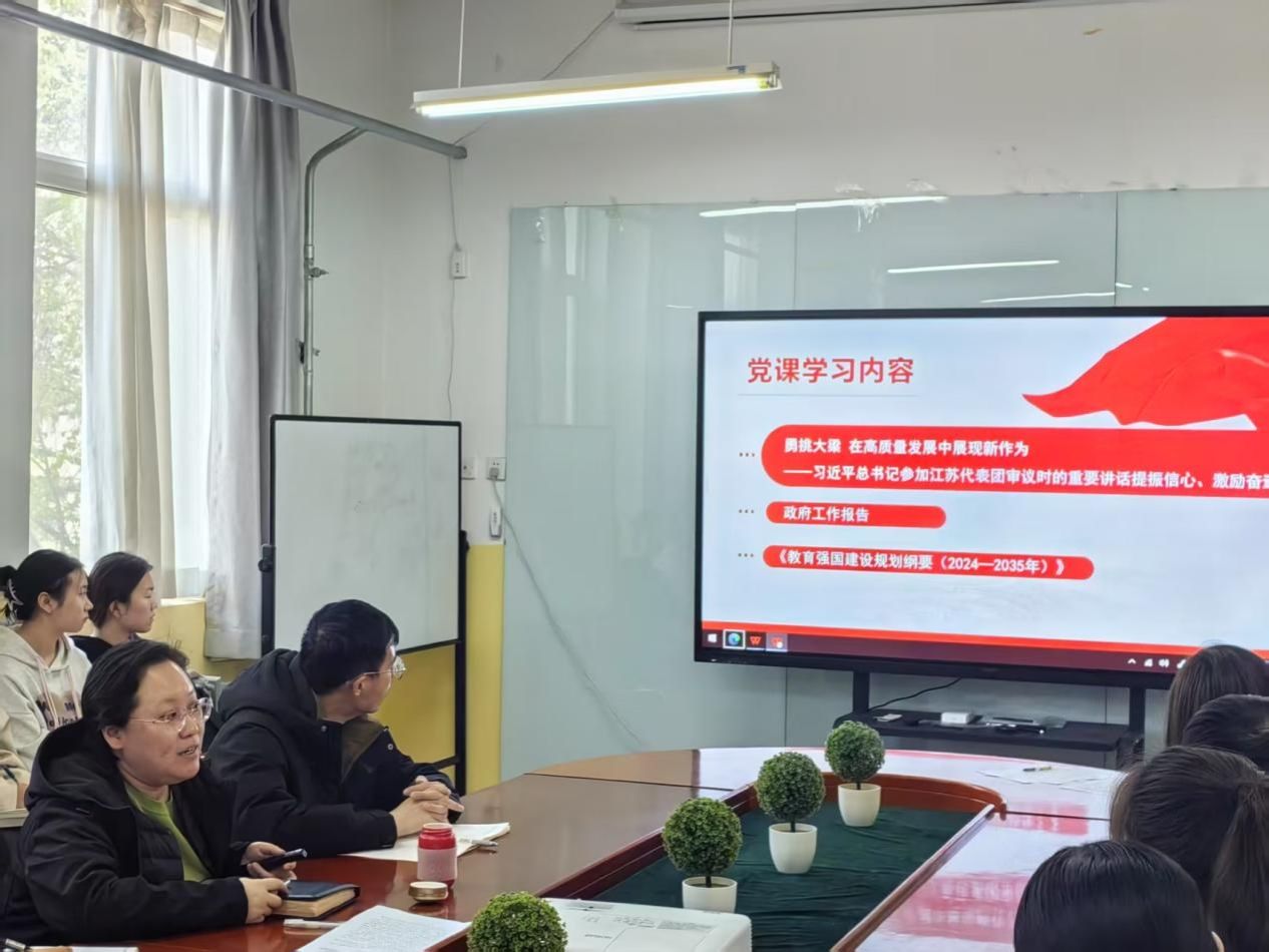 第一议题李扬首先领学了习近平总书记参加江苏代表团审议时的重要讲话。随后围绕“学习2025年全国两会精神”主题,结合《教育强国建设规划纲要(2024—2035年)》讲授专题党课,深入解读了两会报告中的重点内容,包括国家经济发展的新目标、社会民生保障的新举措以及教育改革的新方向,强调员工党员应在专业学习和未来工作中践行两会精神,为中国式现代化贡献力量。
