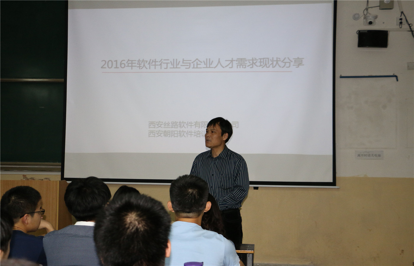 首先西安丝路软件有限责任公司的副总王莺进行了讲话。她向我们分别介绍了在计算机互联网时代,未来应该学会什么、大学努力的方向应该是什么、程序员的分类等问题。并且站在企业的角度为大家介绍企业招聘的关注点:获得过哪些奖项、参加过哪些竞赛、有过哪些作品。她强调,有想法就应该立即行动,大学期间留给我们的有效时间已经不多,要把握住我们的未来。之后西安丝路软件有限责任公司谢经理为大家做了编程软件的操作演示,并为同学们解决了疑惑问题。